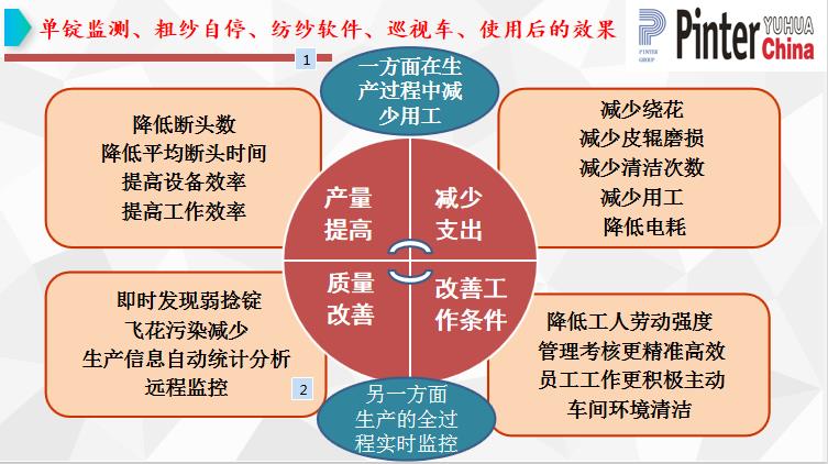 工作环境和劳动强度的改变:使工作变的轻松,提高工人积极性,改变招工难的现状。飞花减少,一方面有利于纱线质量,另一个方面减少污染,环境得以改善,飞花减少,减少清洁次数,增加车间的洁净度。减少挡车工及保全工,降低用工成本。